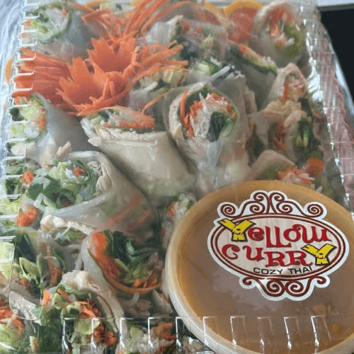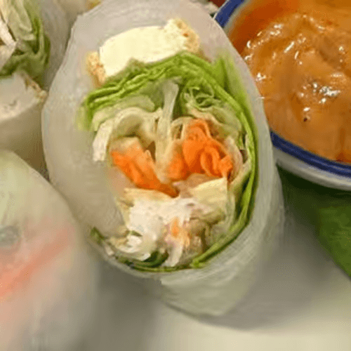 Fresh veggies wrapped with lemongrass chicken and rice noodles. Served with peanut sauce