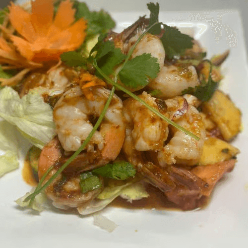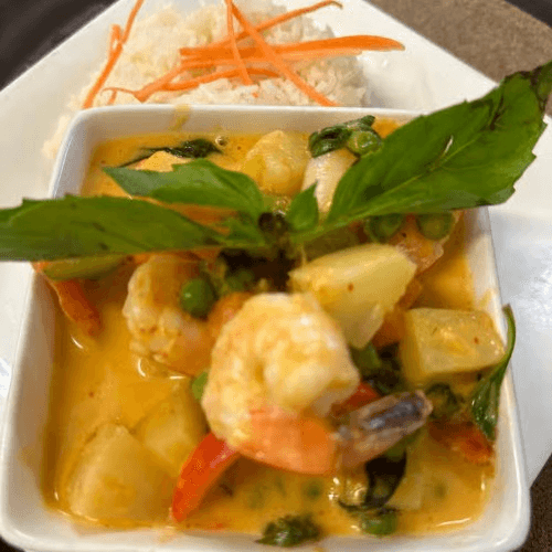 Pineapple, shrimp, pea, carrot, bell, Thai basil, in the red curry creamy sauce