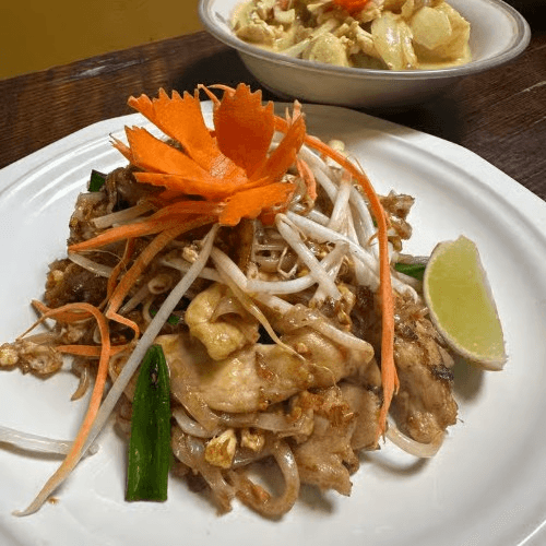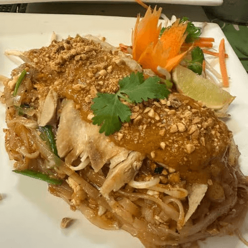Pad Thai noodle, with lemongrass chicken topped with homemade peanut space