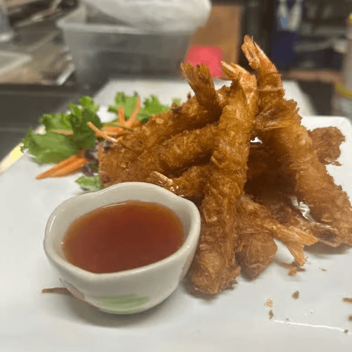 Shrimp rolled in coconut flakes, then fried until crispy. Served with sweet and sour sauce