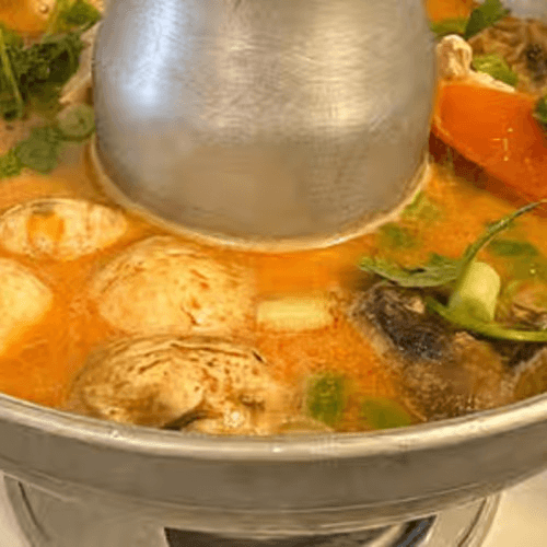 Hot and sour soup with lemongrass. Galangal kaffir leaves, mushrooms, tomatoes and garnished with green onion, cilantro