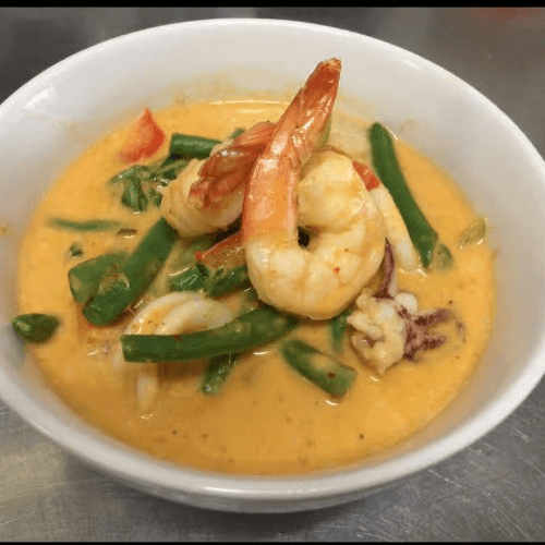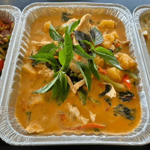 Thai pumpkin in red curry with sweet basil and your choice of meat, a unique flavor of Thai cuisine