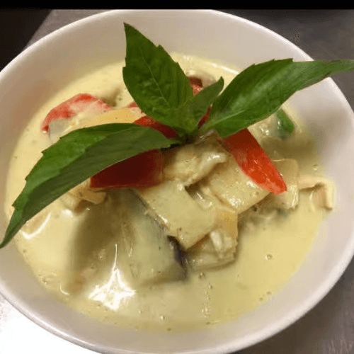 Eggplant, bell peppers, bamboo shoots, sweet basil, coconut milk
