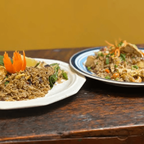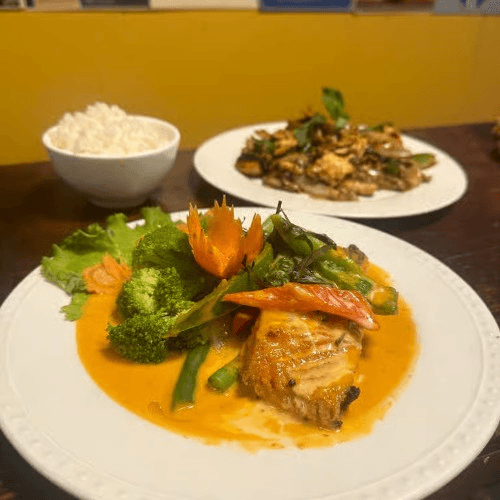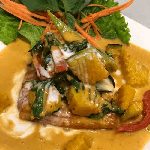Fried salmon topped with a homemade pa-nang curry sauce, bell peppers, and sweet basil