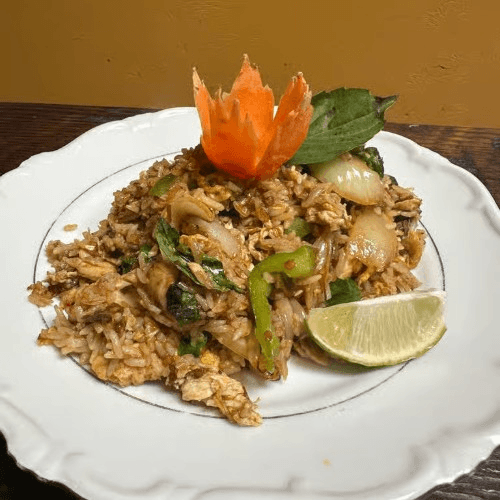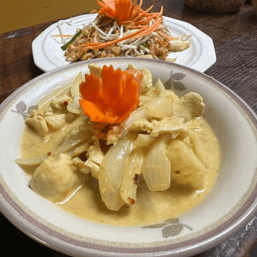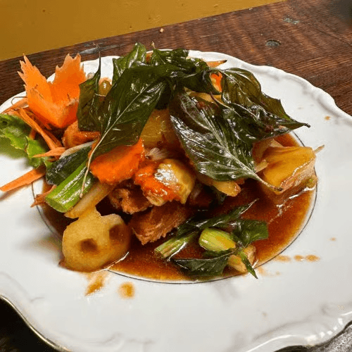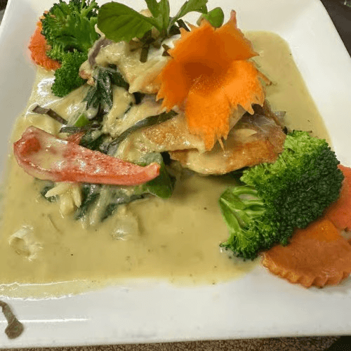 Fried catfish and topped in creamy curry sauce, bell pepper and sweet basil garnished with kiffir leaves