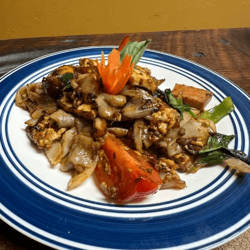 Wide rice noodles, with egg, tomatoes, bell peppers, mushrooms, onions, sweet basil, chili sauce